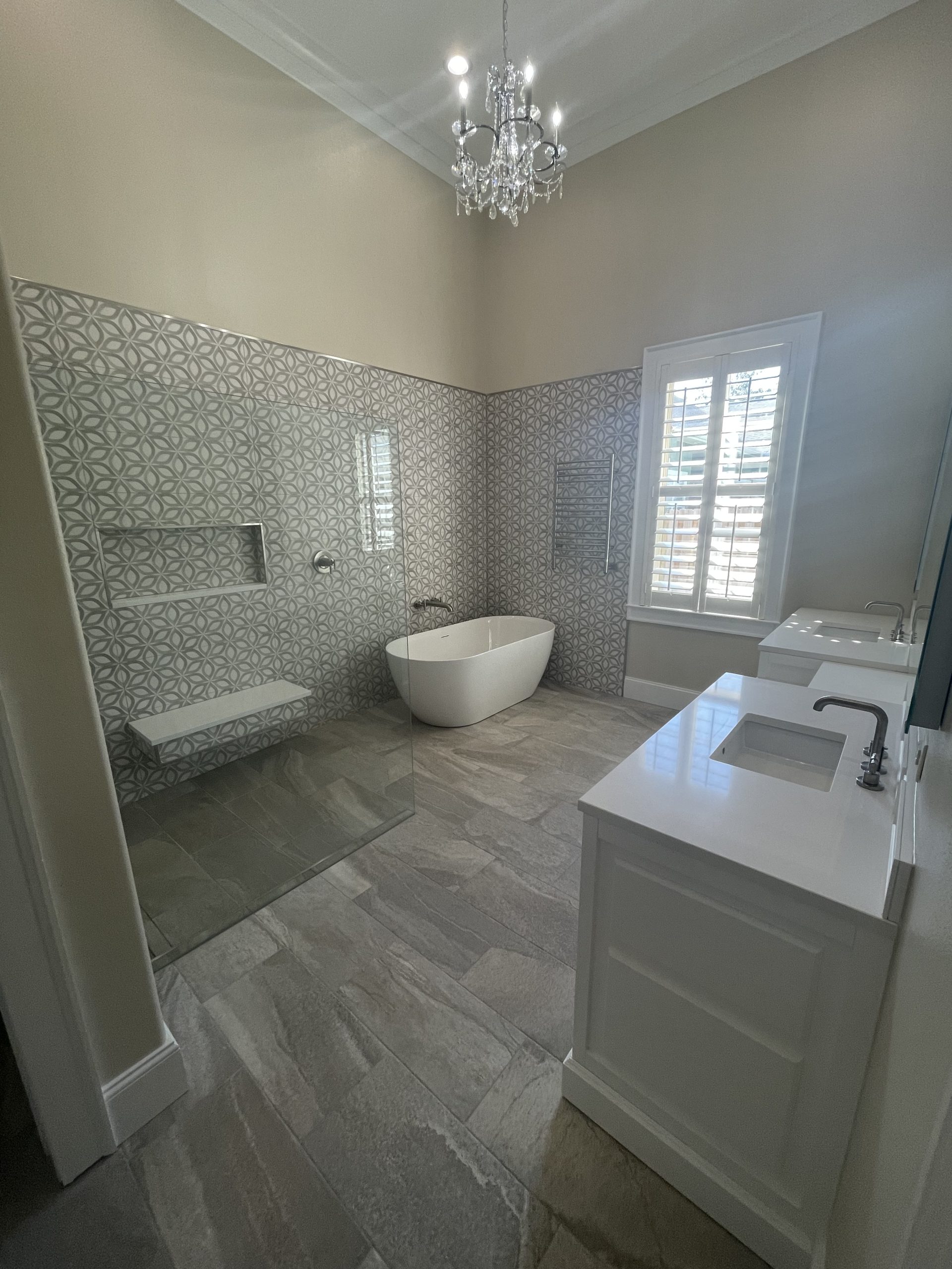Salt + Serenity is a full primary-bath transformation in Grand Pointe, Gulf Breeze that turns an everyday bathroom into a calm, spa-level retreat. We rebuilt the space from the ground up with tile running seamlessly across the floor and up the walls, then anchored the room with a zero-entry shower framed by a clean glass partition. The curb-free layout keeps everything open and easy to move through, while the new shower detailing adds a crisp, coastal feel that fits the home. Total Revision