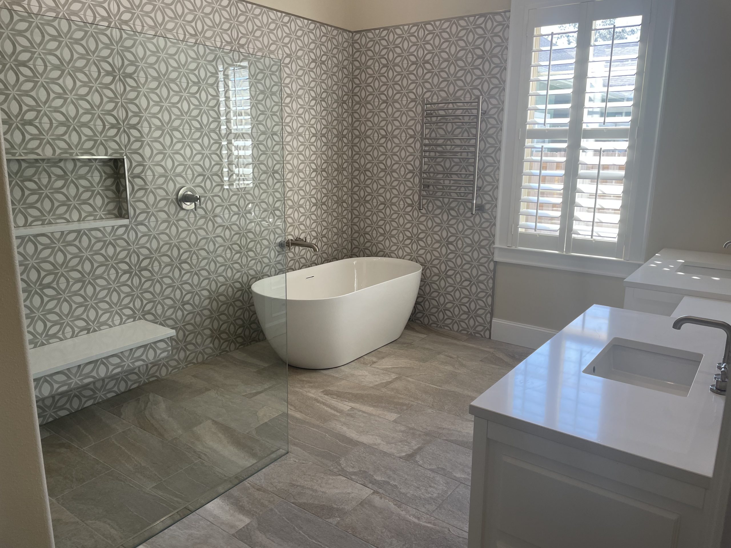 To balance comfort and function, we added a freestanding soaking tub, warm-to-the-touch towel warmer, and LED-lighted mirrors that brighten the room without harsh glare. Fresh vanities bring in smarter storage and a polished finish, giving the homeowners a bathroom that looks sharp, feels relaxing, and is built to hold up to Gulf Coast living.